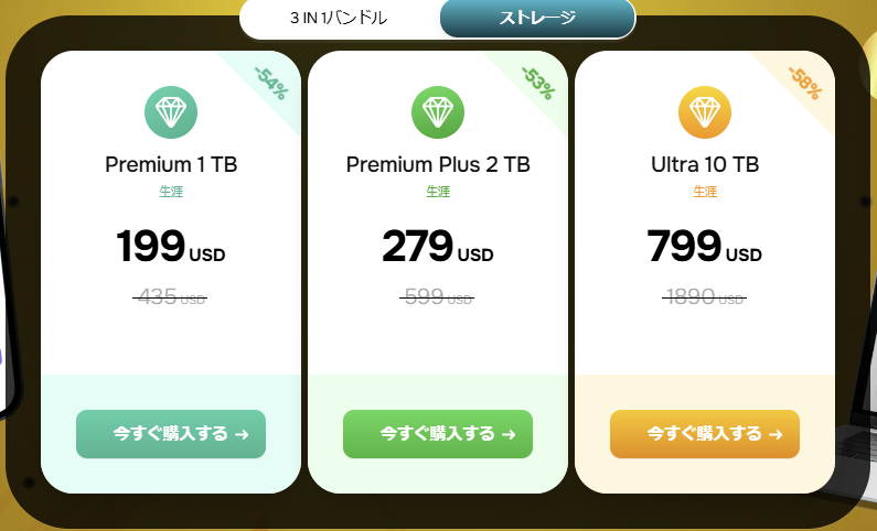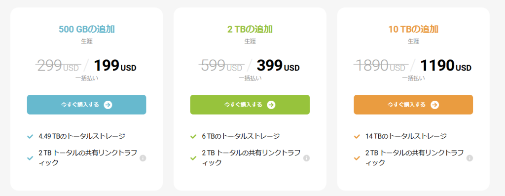 初期費用は高いものの、ライフタイムプランはサブスクリプションよりも長期的に見れば経済的と考えられます。また、上述のとおり、クレジットカードのエラーなど何らかの理由でサブスクの支払が途絶えていた場合にデータが消失するリスクを考慮すると、構造的にストレージサービスにサブスクという仕組みはマッチしていないように思えます。