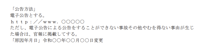 満場異議なくこれに賛成したので、下記のとおり変更することに可決確定した。」の後に、「併せて、電子公告に係るURLを以下の通り変更することについても、代表取締役の説明を受け、出席株主全員の同意によりこれを承認した。(新)https://www.〇〇〇」を追加しました。