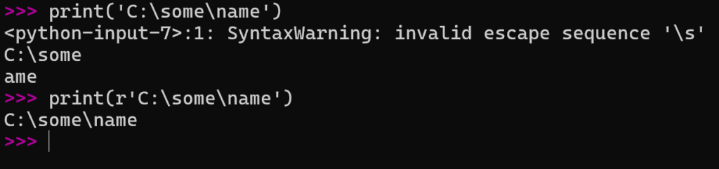 前者の\s は、定義されていないエスケープシーケンス」として SyntaxWarning が出ます。後者のように r を付けた raw文字列リテラル では、バックスラッシュを特別扱いせず、文字そのままに出力します。