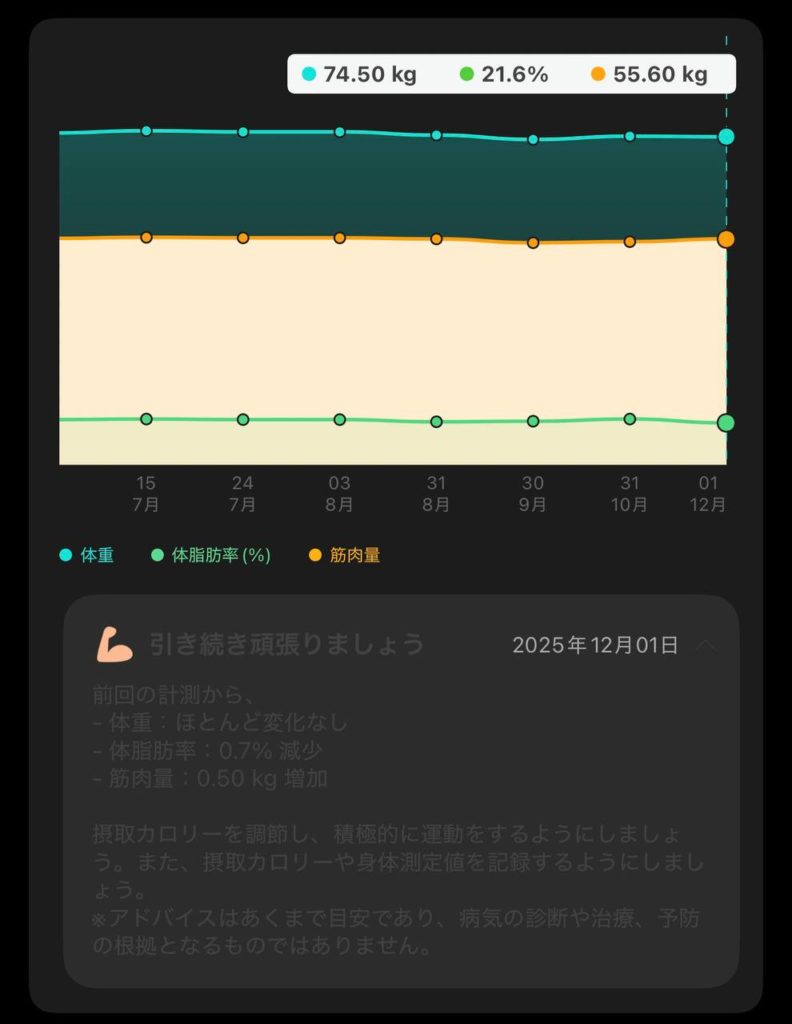 • 体重・体脂肪率はほぼ横ばい(±1kg以内)。