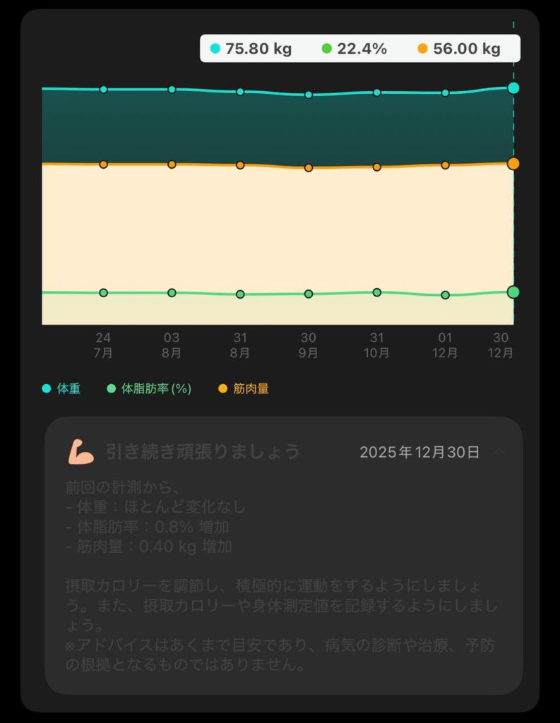 | 体脂肪率 | 22.4% | 21.6% | 22.3% | 21.9% | 21.8% | 22.2% | 22.2% |