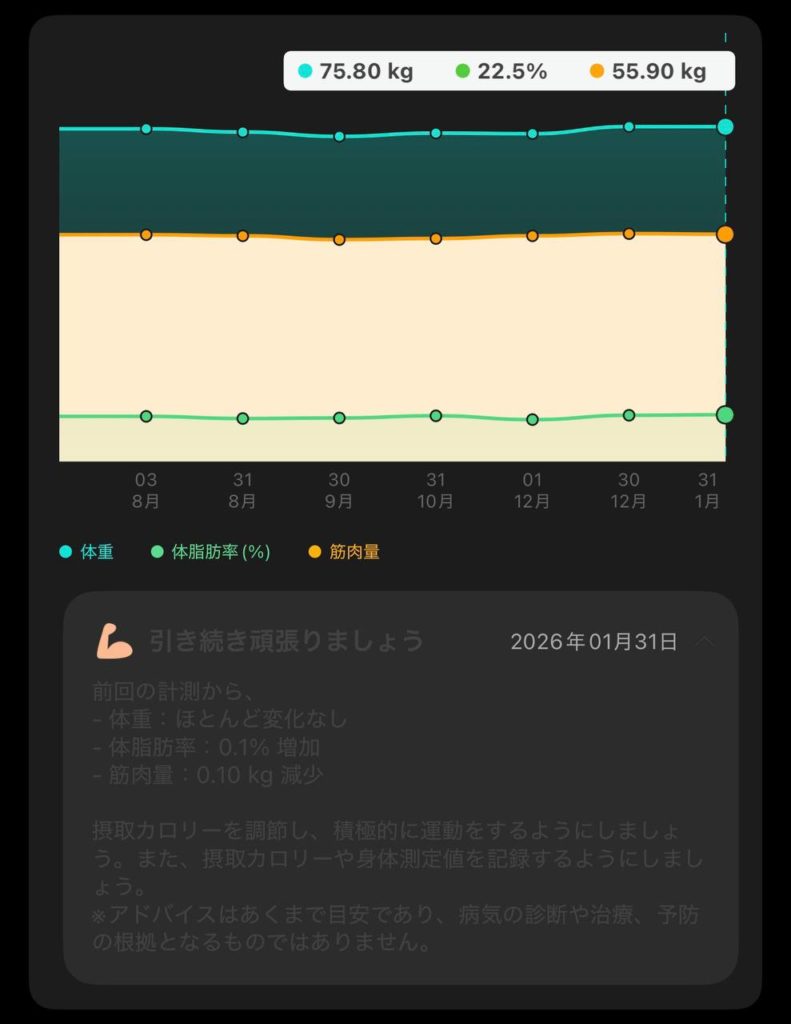 | 筋肉量 | 55.90kg | 56.00kg | 55.60kg | 55.10kg | 54.90kg | 55.60kg | 55.70kg | 55.70kg |